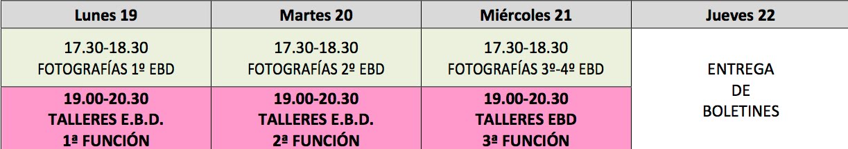 Os recordamos el horario de esta última semana del curso. Es importante que cada grupo esté preparado (vestidos/as y maquillados/as) a las 17.30h el día que tienen asignado para la toma de fotografías. Los demás días acudirán al centro a la hora que su tutor/a les haya indicado.